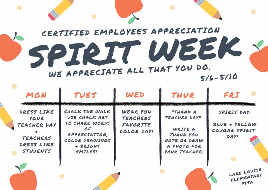 Certified Employees Appreciation Week May 6, 2024May 6, 2024 lakelouiseptsa Happy Certified Employee’s Appreciation week. Thank you Teachers and Staff for all that you do! WE APPRECIATED YOU! Help the PTSA celebrate our Certified staff with spirit week! Please join in and show your appreciation!